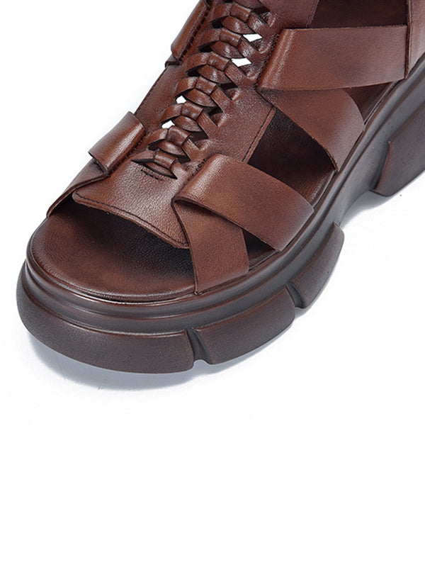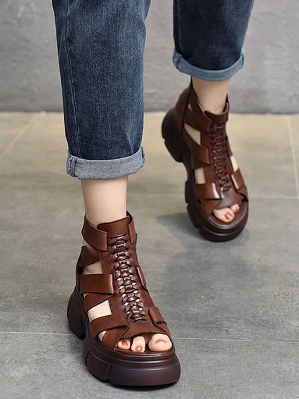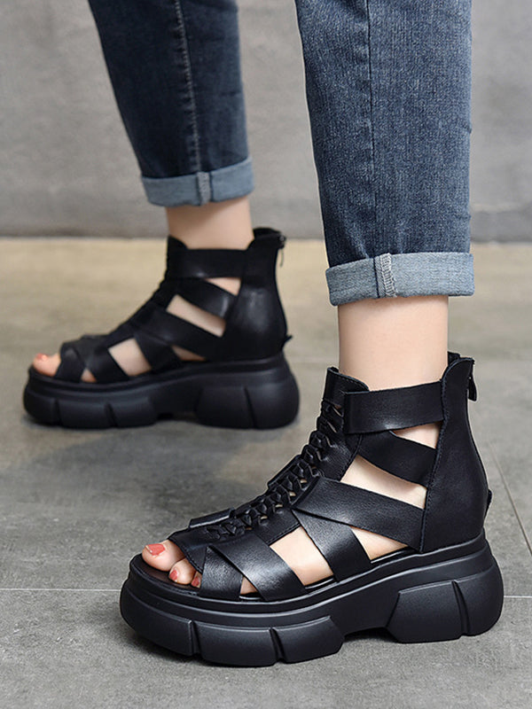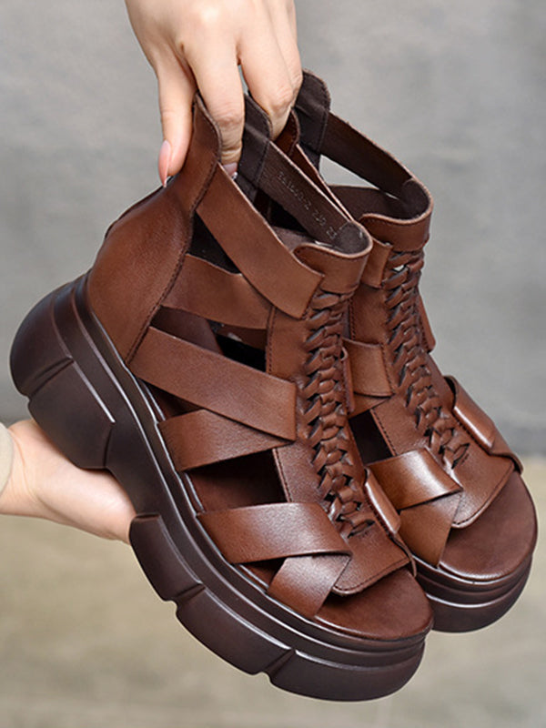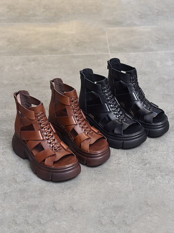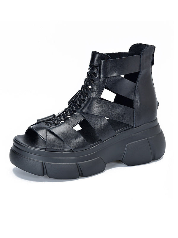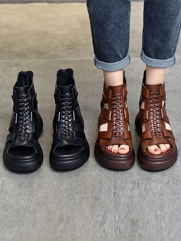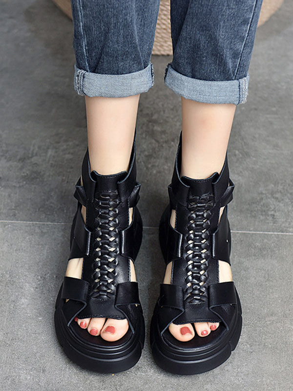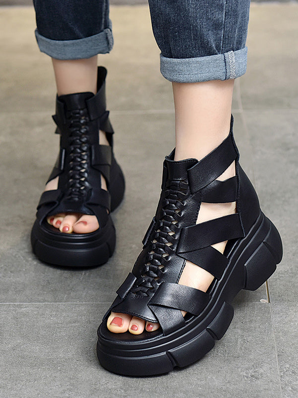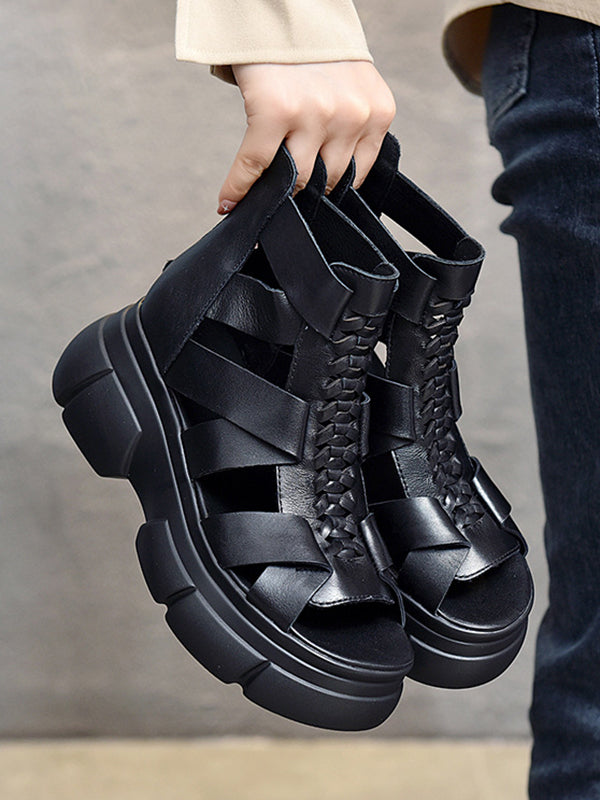 Urban Solid Color Hollow Out Leather Weave Fish Mouth Sandals Platform Shoes