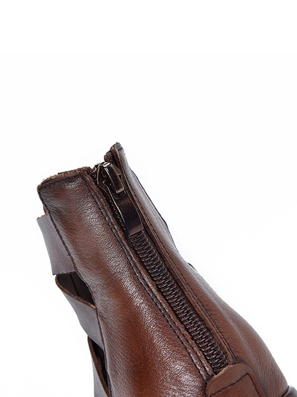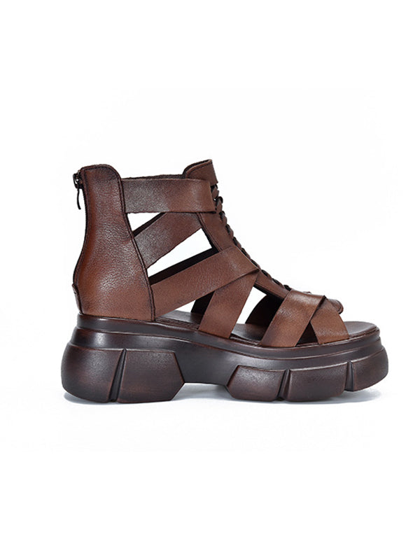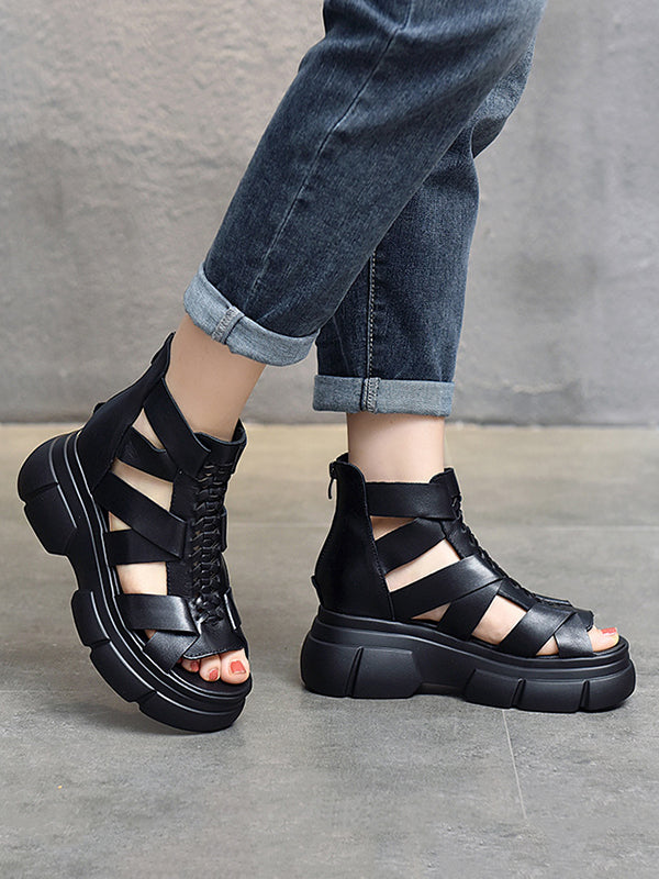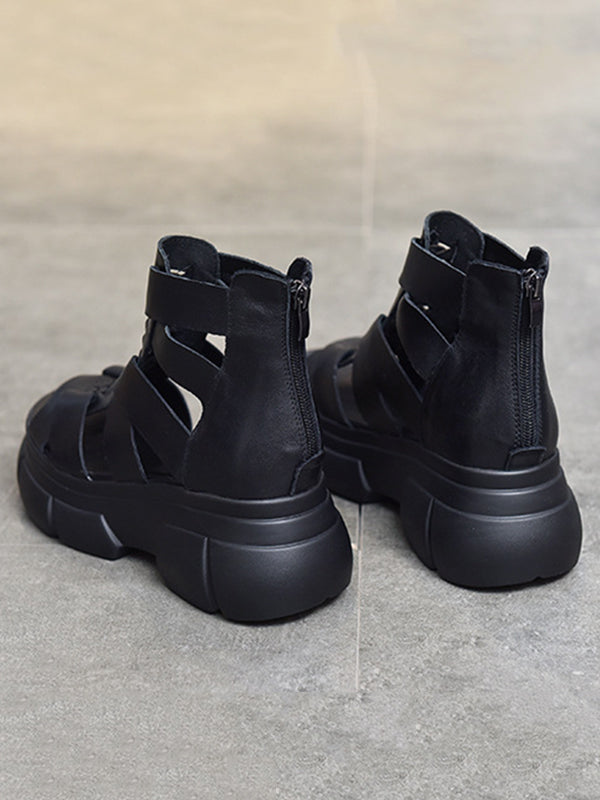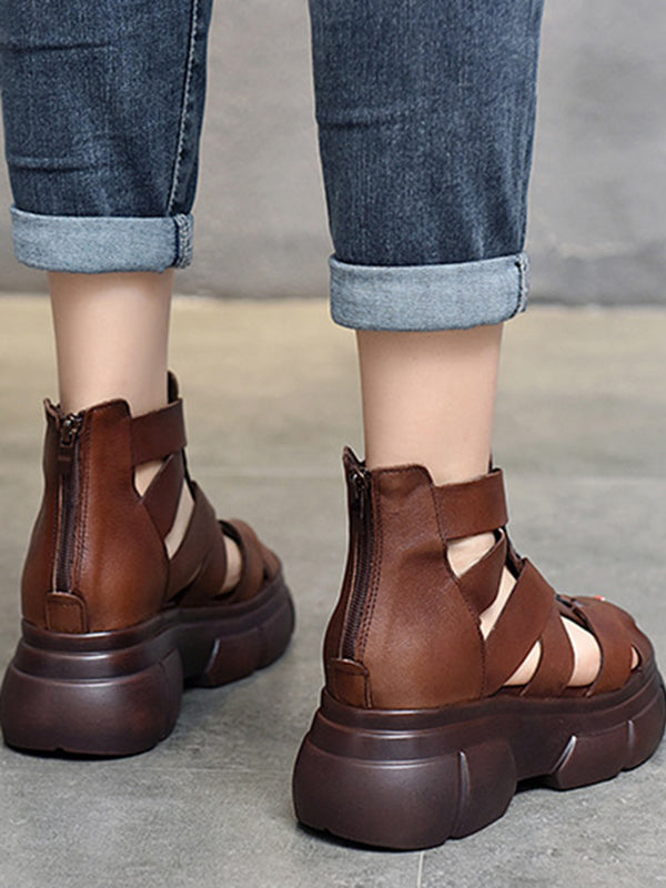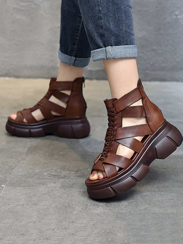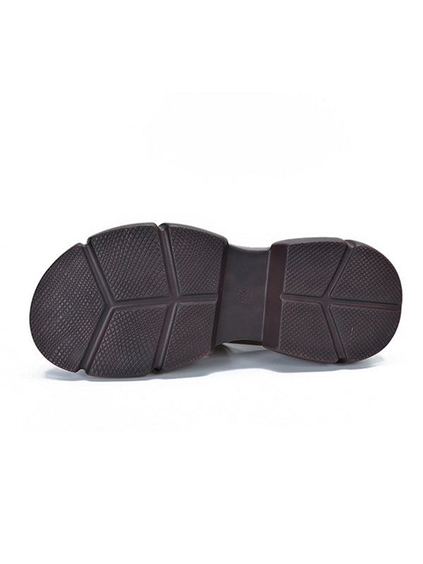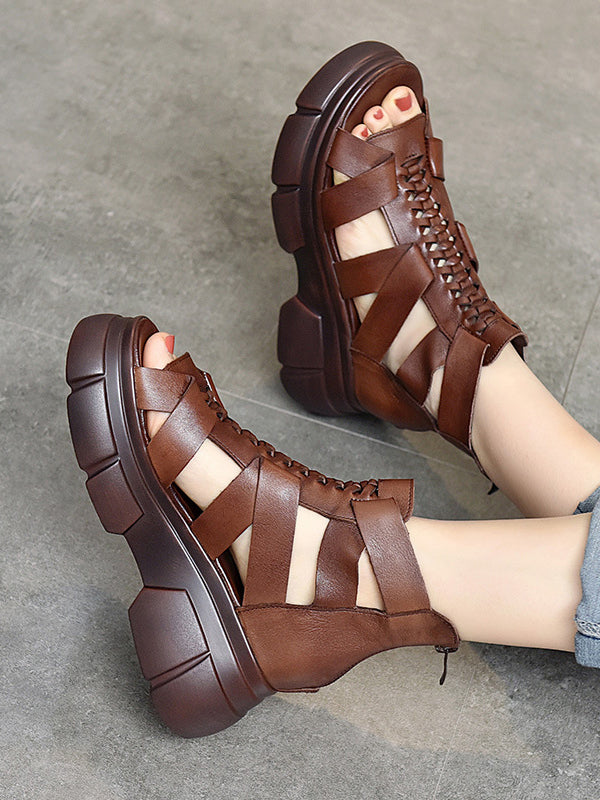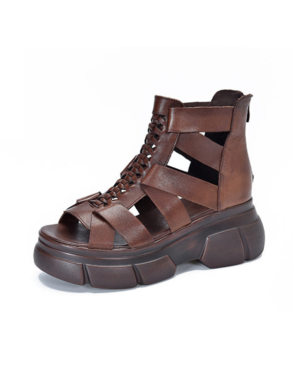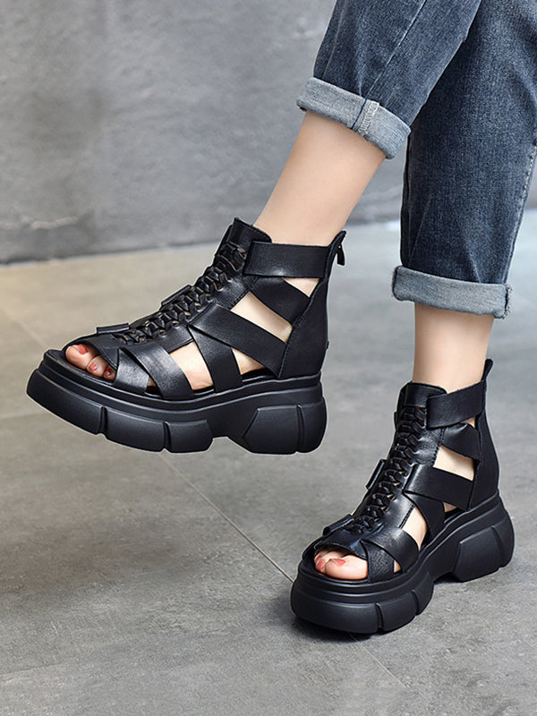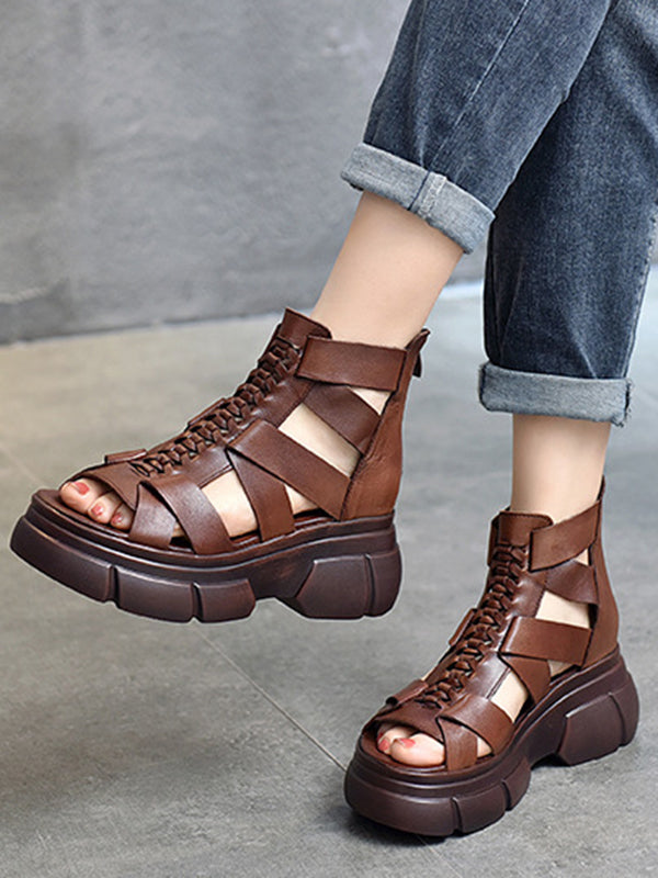 Urban Solid Color Hollow Out Leather Weave Fish Mouth Sandals Platform Shoes